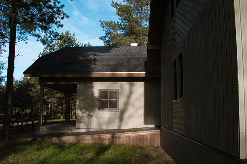 Ein wohnferienhaus, umgeben von Lettischen wäldern. Das haus ist mit nebenkosten, dusche, küche, wohnzimmer und terrasse ausgestattet.